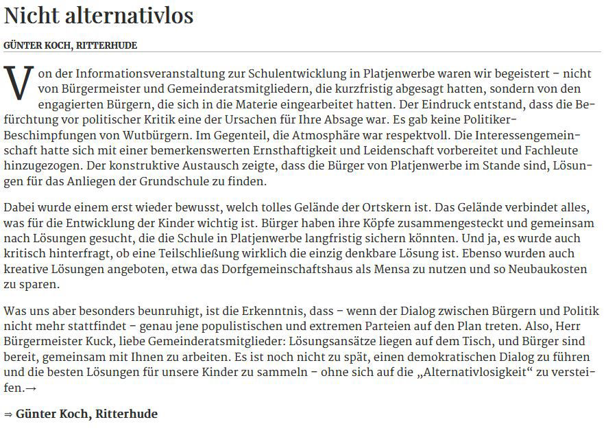 Diese Aussage ist bemerkenswert und interessant. In einem anderen Artikel im Osterholzer Kreisblatt „Haben uns ein Stück weit kaputt gespart“ vom 04./05.01.2025 sprach der Bürgermeister der Gemeinde Ritterhude, Herr Jürgen Kuck, davon, dass es keine Alternativen zum vorliegenden Plan gebe. Es freut uns, wenn nunmehr dagegen noch offen ist, wohin wir uns bewegen und dass die Gelegenheit besteht, gemeinsam an den Plänen über die Schulentwicklung der Gemeinde Ritterhude, insbesondere in Platjenwerbe und Ihlpohl zu arbeiten. Genau dies war immer unsere Intention, unsere Fragen, Sorgen, Wünsche, Ideen und auch Forderungen in die Planungen über die weitere Schulentwicklung einzubinden und uns darüber auszutauschen. Wir fordern den Erhalt und Ausbau beider Schulstandorte in Platjenwerbe und Ihlpohl, wir setzen uns ein für den Erhalt der Grundschule Platjenwerbe als eigenständigen und zweizügigen Standort und für ein Ganztagsangebot an der Grundschule Platjenwerbe.