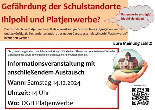 Alle Einwohner Ritterhudes sind eingeladen zum gemeinsamen Treffen des Heimatvereins Platjenwerbe, der Interessengemeinschaft Schulentwicklung Platjenwerbe und Ihlpohl, des Kinder- und Jugendfördervereins Platjenwerbe und der Sportgemeinschaft Platjenwerbe sowie des Schulelternrates zur Schulentwicklung mit Vertretern der Fraktionen, Herrn Sörnsen (Leiter Fachbereich 20 - Bildung, Kultur und Freizeit) und anderen im Dorfgemeinschaftshaus Platjenwerbe am 10.01.2025 um 18.00 Uhr.